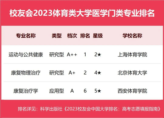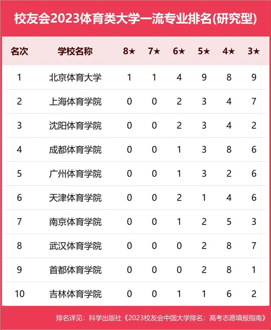 在最新校友會(huì)2023中國(guó)大學(xué)一流專(zhuān)業(yè)排名(研究型)中,北京體育大學(xué)專(zhuān)業(yè)實(shí)力最強(qiáng),專(zhuān)業(yè)水平最高,有1個(gè)中國(guó)八星級(jí)專(zhuān)業(yè)(8★),1個(gè)中國(guó)七星級(jí)專(zhuān)業(yè)(7★),4個(gè)中國(guó)六星級(jí)專(zhuān)業(yè)(6★),9個(gè)中國(guó)五星級(jí)專(zhuān)業(yè)(5★),8個(gè)中國(guó)四星級(jí)專(zhuān)業(yè)(4★),穩(wěn)居校友會(huì)2023中國(guó)體育類(lèi)大學(xué)一流專(zhuān)業(yè)排名(研究型)第一。上海體育學(xué)院有2個(gè)中國(guó)六星級(jí)專(zhuān)業(yè)(6★),3個(gè)中國(guó)五星級(jí)專(zhuān)業(yè)(5★),4個(gè)中國(guó)四星級(jí)專(zhuān)業(yè)(4★),位居第2名。沈陽(yáng)體育學(xué)院有2個(gè)中國(guó)六星級(jí)專(zhuān)業(yè)(6★),3個(gè)中國(guó)五星級(jí)專(zhuān)業(yè)(5★),4個(gè)中國(guó)四星級(jí)專(zhuān)業(yè)(4★),位居第3名。