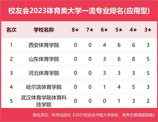 在最新校友會(huì)2023中國(guó)大學(xué)一流專(zhuān)業(yè)排名(應(yīng)用型)中,西安體育學(xué)院專(zhuān)業(yè)實(shí)力最強(qiáng),專(zhuān)業(yè)水平最高,有4個(gè)中國(guó)六星級(jí)專(zhuān)業(yè)(6★),6個(gè)中國(guó)五星級(jí)專(zhuān)業(yè)(5★),6個(gè)中國(guó)四星級(jí)專(zhuān)業(yè)(4★),名列校友會(huì)2023中國(guó)體育類(lèi)大學(xué)一流專(zhuān)業(yè)排名(應(yīng)用型)榜首。山東體育學(xué)院有3個(gè)中國(guó)六星級(jí)專(zhuān)業(yè)(6★),6個(gè)中國(guó)五星級(jí)專(zhuān)業(yè)(5★),8個(gè)中國(guó)四星級(jí)專(zhuān)業(yè)(4★),排行第2名。河北體育學(xué)院有3個(gè)中國(guó)六星級(jí)專(zhuān)業(yè)(6★),3個(gè)中國(guó)五星級(jí)專(zhuān)業(yè)(5★),3個(gè)中國(guó)四星級(jí)專(zhuān)業(yè)(4★),高居第3名。哈爾濱體育學(xué)院有1個(gè)中國(guó)六星級(jí)專(zhuān)業(yè)(6★),4個(gè)中國(guó)五星級(jí)專(zhuān)業(yè)(5★),5個(gè)中國(guó)四星級(jí)專(zhuān)業(yè)(4★),位居第4名。武漢體育學(xué)院體育科技學(xué)院有1個(gè)中國(guó)五星級(jí)專(zhuān)業(yè)(5★),3個(gè)中國(guó)四星級(jí)專(zhuān)業(yè)(4★),排名第5名。