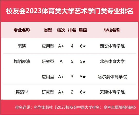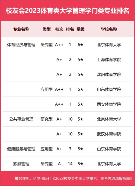 2023年全國(guó)高考即將到來(lái),為了給2023年全國(guó)高考考生及家長(zhǎng)選擇報(bào)考中國(guó)體育類(lèi)院校提供參考指南,全國(guó)第三方大學(xué)評(píng)價(jià)機(jī)構(gòu)艾瑞深校友會(huì)網(wǎng)撰寫(xiě)完成、科學(xué)出版社即將出版發(fā)行的《2023校友會(huì)中國(guó)大學(xué)排名:高考志愿填報(bào)指南》最新發(fā)布校友會(huì)2023中國(guó)體育類(lèi)大學(xué)一流專(zhuān)業(yè)排名、2023中國(guó)體育類(lèi)大學(xué)各門(mén)類(lèi)專(zhuān)業(yè)排名。