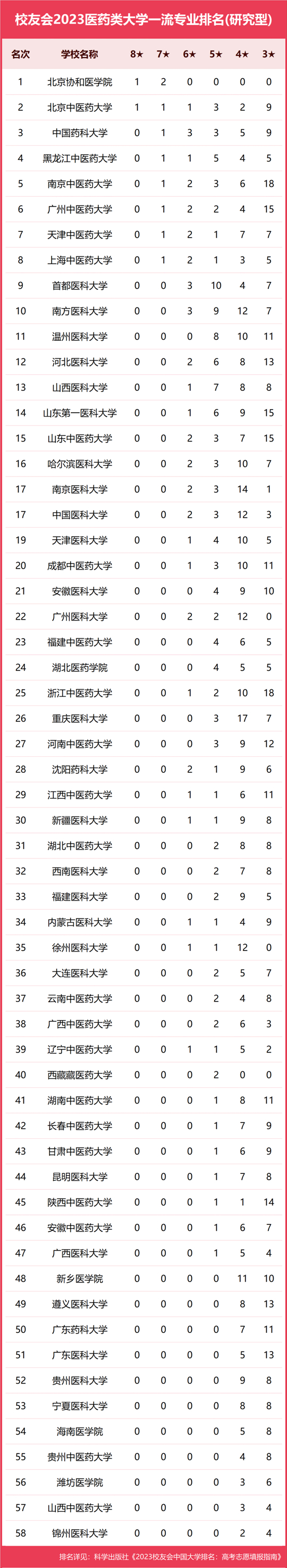 在最新校友會(huì)2023中國(guó)大學(xué)一流專業(yè)排名(研究型)中,北京協(xié)和醫(yī)學(xué)院專業(yè)實(shí)力最強(qiáng),有1個(gè)中國(guó)八星級(jí)專業(yè)(8★),2個(gè)中國(guó)七星級(jí)專業(yè)(7★),高居校友會(huì)2023中國(guó)醫(yī)藥類大學(xué)一流專業(yè)排名(研究型)第一。北京中醫(yī)藥大學(xué)有1個(gè)中國(guó)八星級(jí)專業(yè)(8★),1個(gè)中國(guó)七星級(jí)專業(yè)(7★),1個(gè)中國(guó)六星級(jí)專業(yè)(6★),3個(gè)中國(guó)五星級(jí)專業(yè)(5★),2個(gè)中國(guó)四星級(jí)專業(yè)(4★),排名第2名。中國(guó)藥科大學(xué)有1個(gè)中國(guó)七星級(jí)專業(yè)(7★),3個(gè)中國(guó)六星級(jí)專業(yè)(6★),3個(gè)中國(guó)五星級(jí)專業(yè)(5★),5個(gè)中國(guó)四星級(jí)專業(yè)(4★),排名第3名。黑龍江中醫(yī)藥大學(xué)有1個(gè)中國(guó)七星級(jí)專業(yè)(7★),1個(gè)中國(guó)六星級(jí)專業(yè)(6★),5個(gè)中國(guó)五星級(jí)專業(yè)(5★),4個(gè)中國(guó)四星級(jí)專業(yè)(4★),位居第4名。南京中醫(yī)藥大學(xué)有1個(gè)中國(guó)七星級(jí)專業(yè)(7★),2個(gè)中國(guó)六星級(jí)專業(yè)(6★),3個(gè)中國(guó)五星級(jí)專業(yè)(5★),6個(gè)中國(guó)四星級(jí)專業(yè)(4★),名列第5名。廣州中醫(yī)藥大學(xué)排行第6名。天津中醫(yī)藥大學(xué)排名第7名。上海中醫(yī)藥大學(xué)排行第8名。首都醫(yī)科大學(xué)位居第9名。南方醫(yī)科大學(xué)高居第10名。