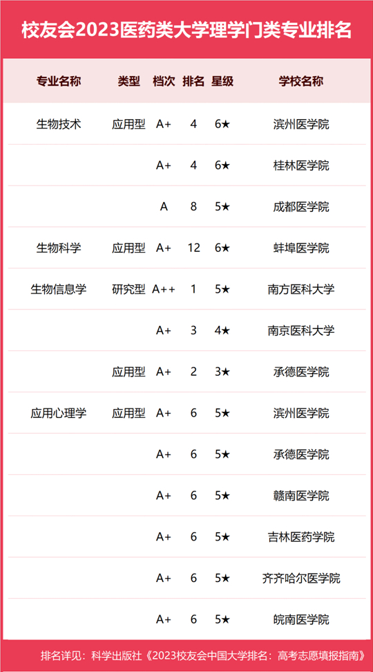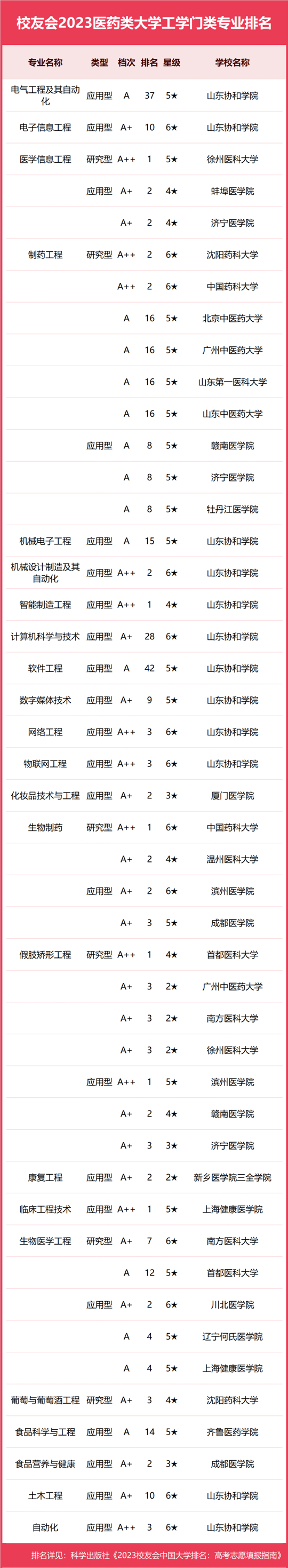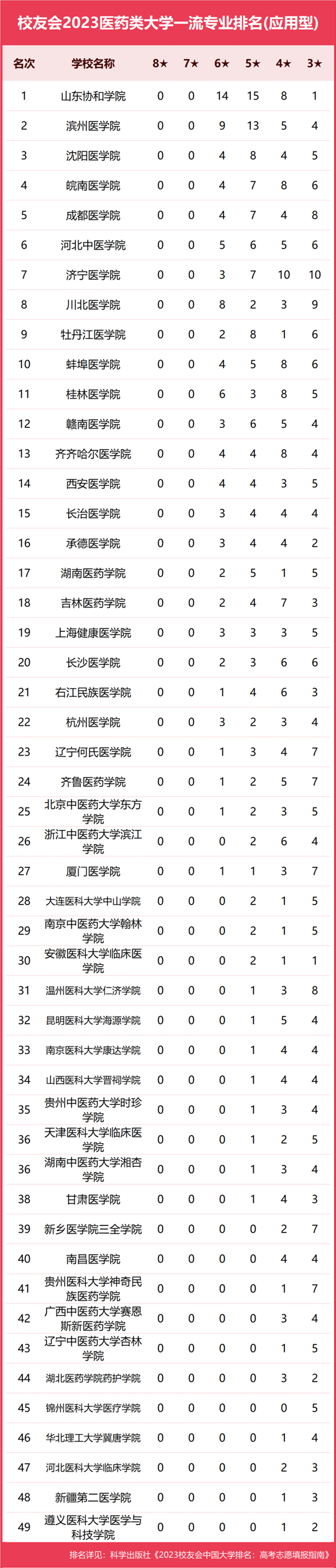 在最新校友會(huì)2023中國(guó)大學(xué)一流專業(yè)排名(應(yīng)用型)中,山東協(xié)和學(xué)院專業(yè)實(shí)力最強(qiáng),有14個(gè)中國(guó)六星級(jí)專業(yè)(6★),15個(gè)中國(guó)五星級(jí)專業(yè)(5★),8個(gè)中國(guó)四星級(jí)專業(yè)(4★),位居校友會(huì)2023中國(guó)醫(yī)藥類大學(xué)一流專業(yè)排名(應(yīng)用型)第一。濱州醫(yī)學(xué)院有9個(gè)中國(guó)六星級(jí)專業(yè)(6★),13個(gè)中國(guó)五星級(jí)專業(yè)(5★),5個(gè)中國(guó)四星級(jí)專業(yè)(4★),名列第2名。沈陽(yáng)醫(yī)學(xué)院有4個(gè)中國(guó)六星級(jí)專業(yè)(6★),8個(gè)中國(guó)五星級(jí)專業(yè)(5★),4個(gè)中國(guó)四星級(jí)專業(yè)(4★),位列第3名。皖南醫(yī)學(xué)院有4個(gè)中國(guó)六星級(jí)專業(yè)(6★),7個(gè)中國(guó)五星級(jí)專業(yè)(5★),8個(gè)中國(guó)四星級(jí)專業(yè)(4★),排名第4名。成都醫(yī)學(xué)院有4個(gè)中國(guó)六星級(jí)專業(yè)(6★),7個(gè)中國(guó)五星級(jí)專業(yè)(5★),4個(gè)中國(guó)四星級(jí)專業(yè)(4★),位列第5名。河北中醫(yī)學(xué)院排名第6名。濟(jì)寧醫(yī)學(xué)院位居第7名。川北醫(yī)學(xué)院高居第8名。牡丹江醫(yī)學(xué)院高居第9名。蚌埠醫(yī)學(xué)院名列第10名。
