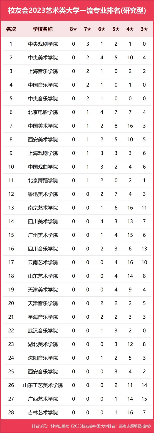 在最新校友會(huì)2023中國(guó)大學(xué)一流專業(yè)排名(研究型)中,中央戲劇學(xué)院專業(yè)實(shí)力最強(qiáng),有3個(gè)中國(guó)七星級(jí)專業(yè)(7★),1個(gè)中國(guó)六星級(jí)專業(yè)(6★),2個(gè)中國(guó)五星級(jí)專業(yè)(5★),1個(gè)中國(guó)四星級(jí)專業(yè)(4★),榮登校友會(huì)2023中國(guó)藝術(shù)類大學(xué)一流專業(yè)排名(研究型)冠軍。中央美術(shù)學(xué)院有2個(gè)中國(guó)七星級(jí)專業(yè)(7★),4個(gè)中國(guó)六星級(jí)專業(yè)(6★),5個(gè)中國(guó)五星級(jí)專業(yè)(5★),10個(gè)中國(guó)四星級(jí)專業(yè)(4★),位居第2名。上海音樂學(xué)院有2個(gè)中國(guó)七星級(jí)專業(yè)(7★),1個(gè)中國(guó)六星級(jí)專業(yè)(6★),2個(gè)中國(guó)四星級(jí)專業(yè)(4★),高居第3名。