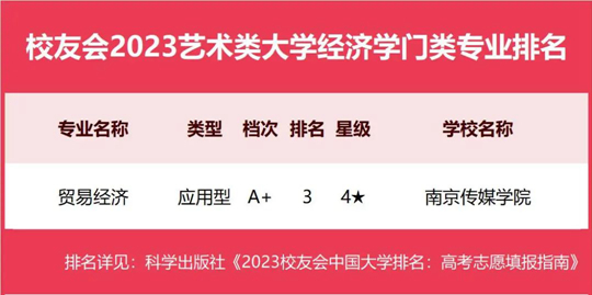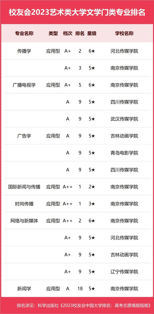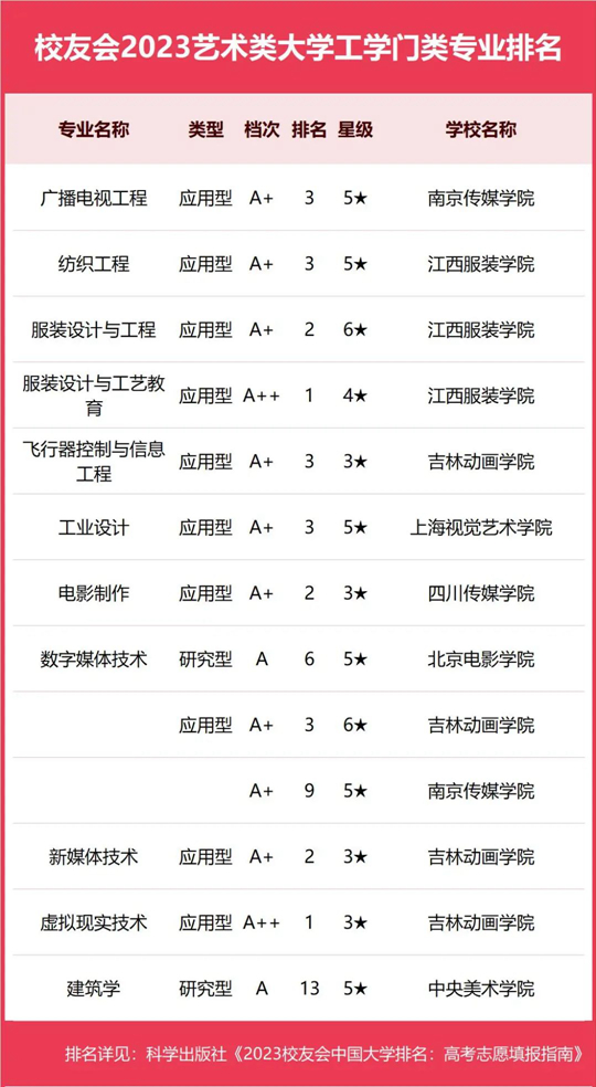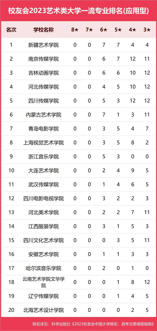 在最新校友會(huì)2023中國(guó)大學(xué)一流專業(yè)排名(應(yīng)用型)中,新疆藝術(shù)學(xué)院專業(yè)水平最高,有7個(gè)中國(guó)六星級(jí)專業(yè)(6★),7個(gè)中國(guó)五星級(jí)專業(yè)(5★),4個(gè)中國(guó)四星級(jí)專業(yè)(4★),穩(wěn)居校友會(huì)2023中國(guó)藝術(shù)類大學(xué)一流專業(yè)排名(應(yīng)用型)冠軍。南京傳媒學(xué)院有6個(gè)中國(guó)六星級(jí)專業(yè)(6★),7個(gè)中國(guó)五星級(jí)專業(yè)(5★),12個(gè)中國(guó)四星級(jí)專業(yè)(4★),排名第2名。吉林動(dòng)畫學(xué)院有6個(gè)中國(guó)六星級(jí)專業(yè)(6★),6個(gè)中國(guó)五星級(jí)專業(yè)(5★),10個(gè)中國(guó)四星級(jí)專業(yè)(4★),排名第3名。