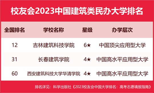 在最新校友會2023中國民辦大學(xué)排名中,吉林建筑科技學(xué)院辦學(xué)實(shí)力最強(qiáng)、最具競爭力、辦學(xué)水平最高,全國排名第12名,穩(wěn)居校友會2023中國建筑類民辦大學(xué)排名榜首。長春建筑學(xué)院排名全國第31名,排名第2名。西安建筑科技大學(xué)華清學(xué)院排名全國第60名,排名第3名。