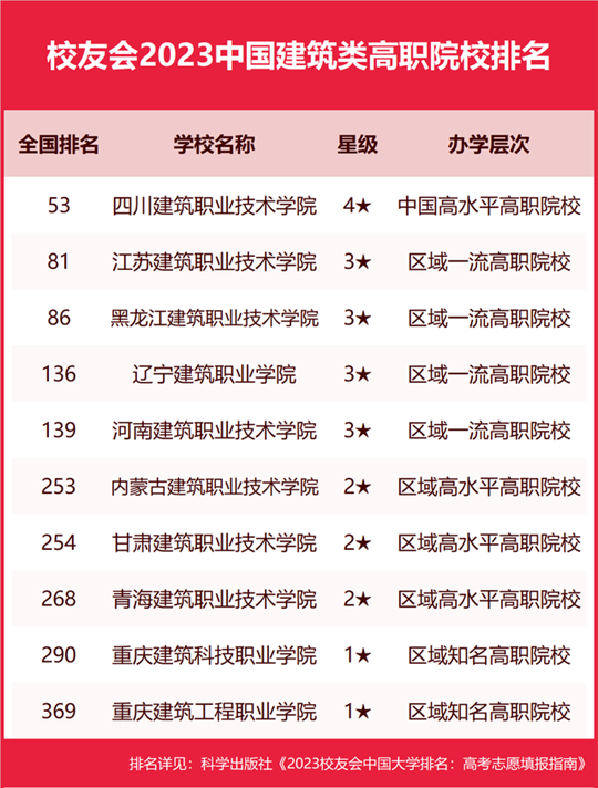 在最新校友會2023中國高職院校排名中,四川建筑職業(yè)技術(shù)學(xué)院實(shí)力最強(qiáng),全國排名第53名,雄居校友會2023中國建筑類高職院校排名第一。江蘇建筑職業(yè)技術(shù)學(xué)院排名全國第81名,排行第2名。黑龍江建筑職業(yè)技術(shù)學(xué)院名列全國第86名,排名第3名。遼寧建筑職業(yè)學(xué)院高居全國第136名,位列第4名。河南建筑職業(yè)技術(shù)學(xué)院位居全國第139名,排名第5名。