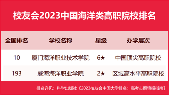 在最新校友會2023中國高職院校排名中,廈門海洋職業(yè)技術(shù)學(xué)院綜合排名最高、辦學(xué)水平最高,全國排名第10名,雄居校友會2023中國海洋類高職院校排名冠軍。
