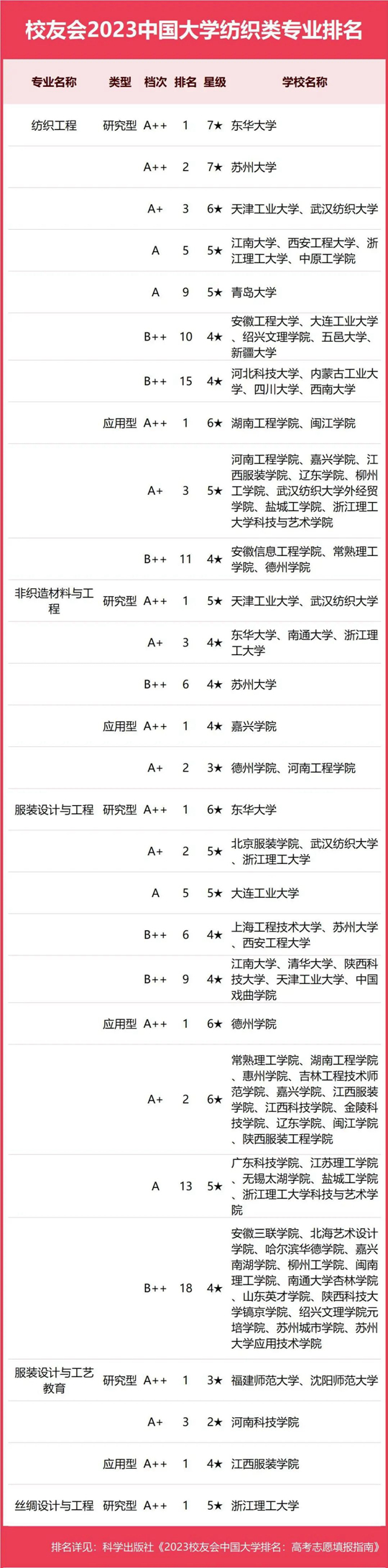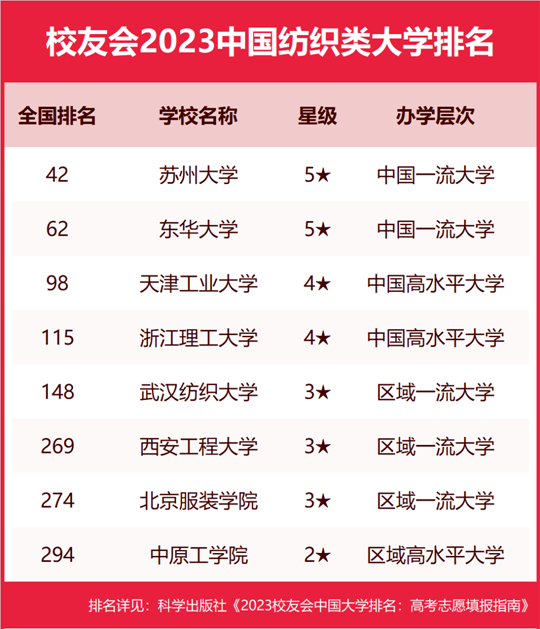 | 校友會2023中國紡織類大學(xué)排名,蘇州大學(xué)、浙江紡織服裝職業(yè)技術(shù)學(xué)院第一 |