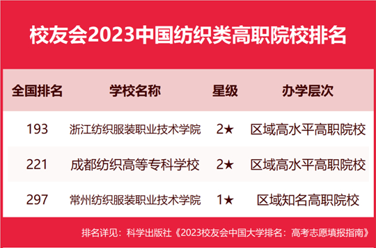 在最新校友會2023中國高職院校排名中,浙江紡織服裝職業(yè)技術(shù)學(xué)院辦學(xué)實力最強(qiáng)、最具競爭力、辦學(xué)水平最高,全國排名第193名,名列校友會2023中國紡織類高職院校排名第一。