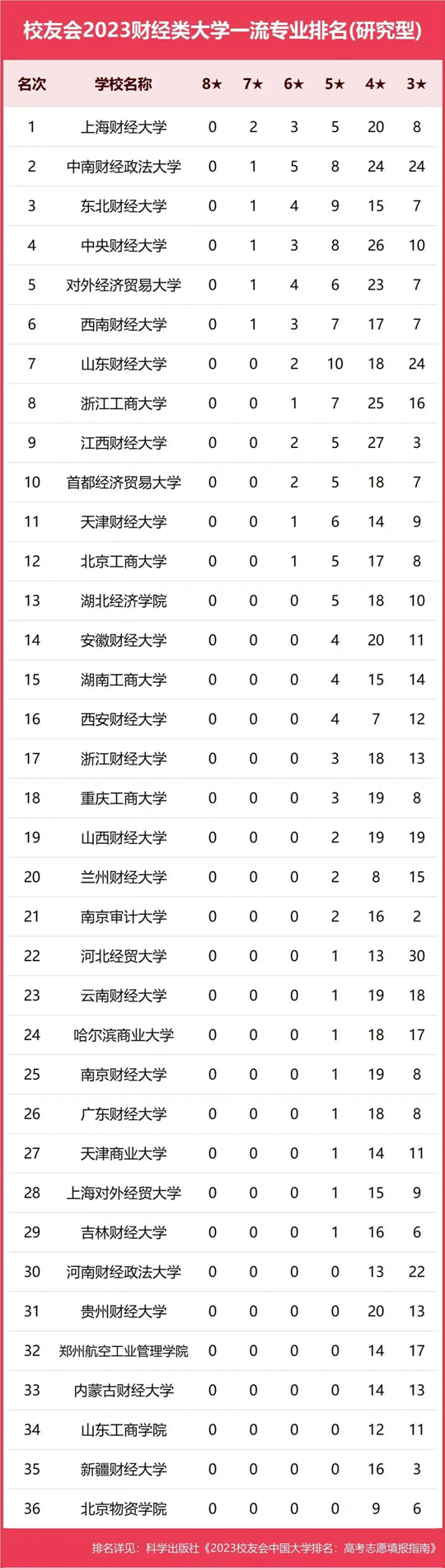 在最新校友會2023中國大學(xué)一流專業(yè)排名(研究型)中,上海財經(jīng)大學(xué)專業(yè)實力最強,專業(yè)水平最高,有2個中國七星級專業(yè)(7★),3個中國六星級專業(yè)(6★),5個中國五星級專業(yè)(5★),20個中國四星級專業(yè)(4★),榮登校友會2023中國財經(jīng)類大學(xué)一流專業(yè)排名(研究型)第一。中南財經(jīng)政法大學(xué)有1個中國七星級專業(yè)(7★),5個中國六星級專業(yè)(6★),8個中國五星級專業(yè)(5★),24個中國四星級專業(yè)(4★),高居第2名。東北財經(jīng)大學(xué)有1個中國七星級專業(yè)(7★),4個中國六星級專業(yè)(6★),9個中國五星級專業(yè)(5★),15個中國四星級專業(yè)(4★),位列第3名。