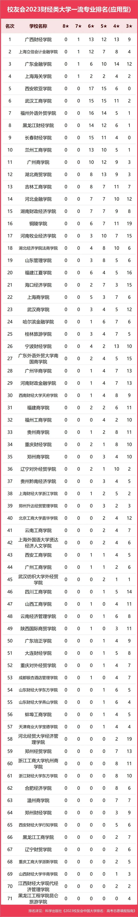 在最新校友會2023中國大學(xué)一流專業(yè)排名(應(yīng)用型)中,廣西財經(jīng)學(xué)院專業(yè)實力最強,專業(yè)建設(shè)水平最高,有1個中國七星級專業(yè)(7★),13個中國六星級專業(yè)(6★),12個中國五星級專業(yè)(5★),13個中國四星級專業(yè)(4★),名列校友會2023中國財經(jīng)類大學(xué)一流專業(yè)排名(應(yīng)用型)榜首。上海立信會計金融學(xué)院有1個中國七星級專業(yè)(7★),12個中國六星級專業(yè)(6★),7個中國五星級專業(yè)(5★),8個中國四星級專業(yè)(4★),位居第2名。廣東金融學(xué)院有1個中國七星級專業(yè)(7★),6個中國六星級專業(yè)(6★),10個中國五星級專業(yè)(5★),14個中國四星級專業(yè)(4★),位列第3名。