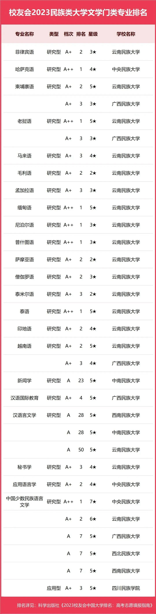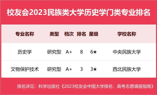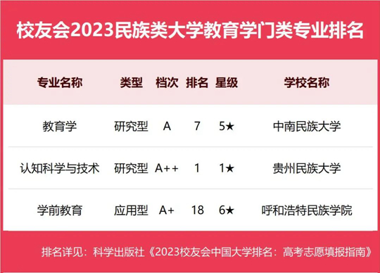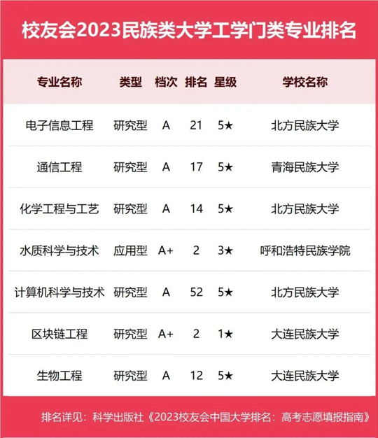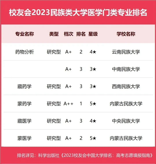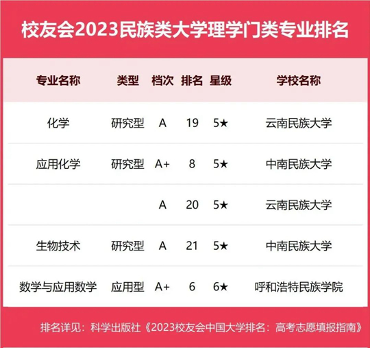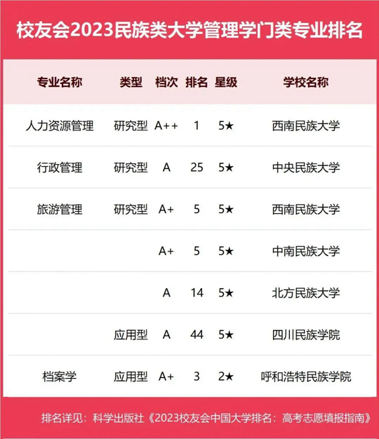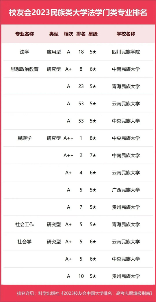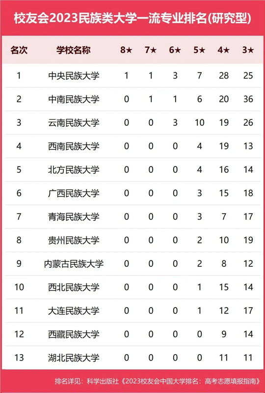 2023年全國(guó)高考即將到來(lái),為了給2023年全國(guó)高考考生及家長(zhǎng)選擇報(bào)考中國(guó)民族類高等院校提供參考指南,全國(guó)第三方大學(xué)評(píng)價(jià)機(jī)構(gòu)艾瑞深校友會(huì)網(wǎng)撰寫(xiě)完成、科學(xué)出版社即將出版發(fā)行的《2023校友會(huì)中國(guó)大學(xué)排名:高考志愿填報(bào)指南》最新發(fā)布校友會(huì)2023中國(guó)民族類大學(xué)一流專業(yè)排名、2023中國(guó)民族類大學(xué)各門類專業(yè)排名。