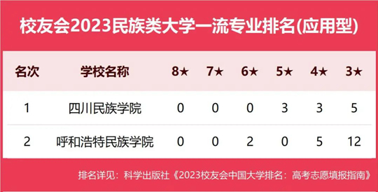 在最新校友會(huì)2023中國(guó)大學(xué)一流專業(yè)排名(應(yīng)用型)中,四川民族學(xué)院專業(yè)水平最高,有3個(gè)中國(guó)五星級(jí)專業(yè)(5★),3個(gè)中國(guó)四星級(jí)專業(yè)(4★),高居校友會(huì)2023中國(guó)民族類大學(xué)一流專業(yè)排名(應(yīng)用型)第一。呼和浩特民族學(xué)院有2個(gè)中國(guó)六星級(jí)專業(yè)(6★),5個(gè)中國(guó)四星級(jí)專業(yè)(4★),名列第2名。