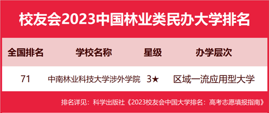 在最新校友會(huì)2023中國民辦大學(xué)排名中,中南林業(yè)科技大學(xué)涉外學(xué)院實(shí)力最強(qiáng),全國排名第71名,奪得校友會(huì)2023中國林業(yè)類民辦大學(xué)排名冠軍。