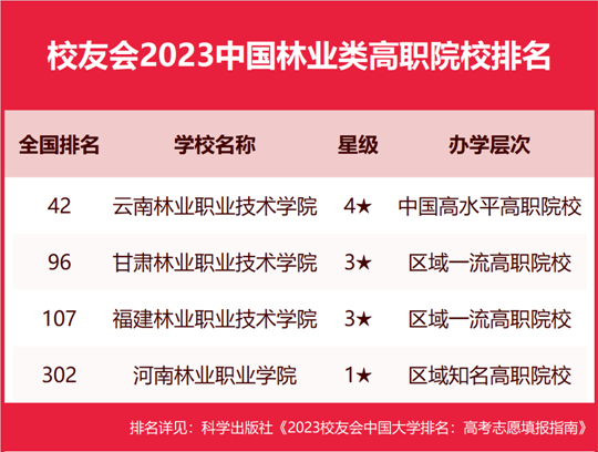 在最新校友會(huì)2023中國高職院校排名中,云南林業(yè)職業(yè)技術(shù)學(xué)院實(shí)力最強(qiáng)、水平最高、最具競爭力,全國排名第42名,名列校友會(huì)2023中國林業(yè)類高職院校排名第一。