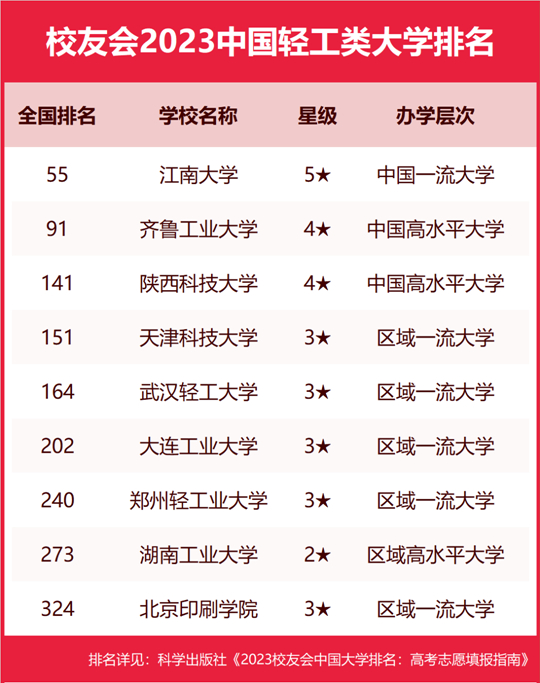 | 校友會2023中國輕工類大學(xué)排名,江南大學(xué)、齊魯工業(yè)大學(xué)前二 |