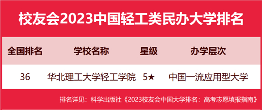 在最新校友會2023中國民辦大學(xué)排名中,華北理工大學(xué)輕工學(xué)院實(shí)力最強(qiáng)、水平最高、最具競爭力,全國排名第36名,奪得校友會2023中國輕工類民辦大學(xué)排名第一。