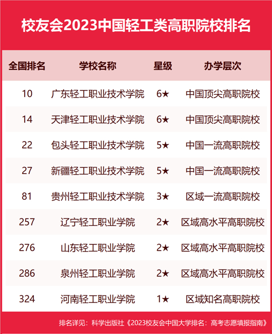 在最新校友會2023中國高職院校排名中,廣東輕工職業(yè)技術(shù)學(xué)院辦學(xué)實(shí)力最強(qiáng)、最具競爭力、辦學(xué)水平最高,全國排名第10名,高居校友會2023中國輕工類高職院校排名第一。天津輕工職業(yè)技術(shù)學(xué)院位列全國第14名,排行第2名。包頭輕工職業(yè)技術(shù)學(xué)院位居全國第22名,名列第3名。