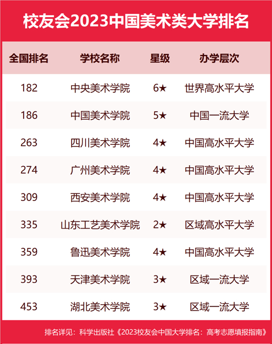 在最新校友會(huì)2023中國(guó)大學(xué)排名中,中央美術(shù)學(xué)院綜合實(shí)力排名最高、辦學(xué)水平最高,全國(guó)排名第182名,雄居校友會(huì)2023中國(guó)美術(shù)類大學(xué)排名榜首。中國(guó)美術(shù)學(xué)院排名全國(guó)第186名,名列第2名。四川美術(shù)學(xué)院位列全國(guó)第263名,位列第3名。
