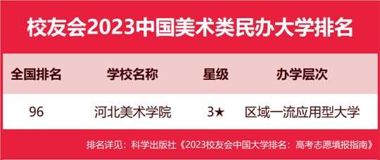 在最新校友會(huì)2023中國(guó)民辦大學(xué)排名中,河北美術(shù)學(xué)院實(shí)力最強(qiáng),全國(guó)排名第96名,榮登校友會(huì)2023中國(guó)美術(shù)類民辦大學(xué)排名冠軍。