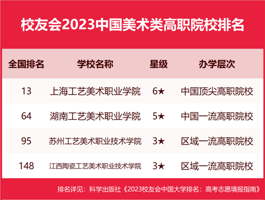 在最新校友會(huì)2023中國(guó)高職院校排名中,上海工藝美術(shù)職業(yè)學(xué)院辦學(xué)實(shí)力最強(qiáng)、最具核心競(jìng)爭(zhēng)力,全國(guó)排名第13名,榮登校友會(huì)2023中國(guó)美術(shù)類高職院校排名首位。湖南工藝美術(shù)職業(yè)學(xué)院排行全國(guó)第64名,排行第2名。蘇州工藝美術(shù)職業(yè)技術(shù)學(xué)院高居全國(guó)第95名,排行第3名。江西陶瓷工藝美術(shù)職業(yè)技術(shù)學(xué)院排行全國(guó)第148名,高居第4名。