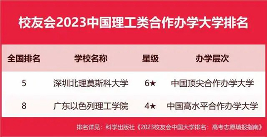 在最新校友會(huì)2023中國(guó)合作辦學(xué)大學(xué)排名中,深圳北理莫斯科大學(xué)實(shí)力最強(qiáng)、水平最高、最具競(jìng)爭(zhēng)力,全國(guó)排名第5名,位列校友會(huì)2023中國(guó)理工類合作辦學(xué)大學(xué)排名第一。廣東以色列理工學(xué)院名列全國(guó)第8名,高居第2名。