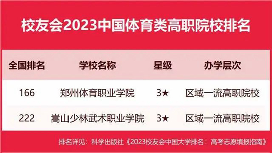 鄭州體育職業(yè)學院問鼎2023中國體育類高職院校排名第一,嵩山少林武術(shù)職業(yè)學院第二