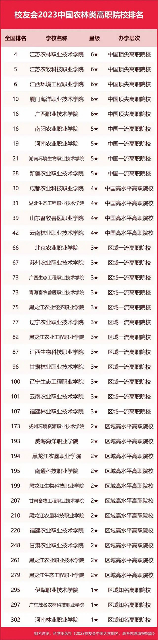 黃河水利職業(yè)技術(shù)學(xué)院、深圳職業(yè)技術(shù)學(xué)院、江蘇經(jīng)貿(mào)職業(yè)技術(shù)學(xué)院奪得2023中國(guó)高職院校排名首位。江蘇農(nóng)林職業(yè)技術(shù)學(xué)院穩(wěn)居校友會(huì)2023中國(guó)農(nóng)林類高職院校排名冠軍。海南科技職業(yè)大學(xué)名列2023中國(guó)職業(yè)技術(shù)大學(xué)排名第一。廣西農(nóng)業(yè)職業(yè)技術(shù)大學(xué)奪得校友會(huì)2023中國(guó)農(nóng)林類職業(yè)技術(shù)大學(xué)排名首位。