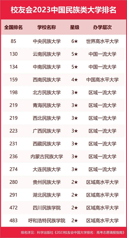 | 校友會2023中國民族類大學(xué)排名,中央民族大學(xué)第一,中南民族大學(xué)第三 |