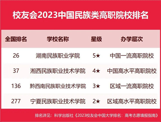 在最新校友會2023中國高職院校排名中,湖南民族職業(yè)學(xué)院綜合實(shí)力排名最高、辦學(xué)水平最高,全國排名第26名,雄居校友會2023中國民族類高職院校排名冠軍。
