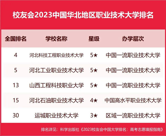 在最新校友會2023中國職業(yè)技術(shù)大學(xué)排名中,河北科技工程職業(yè)技術(shù)大學(xué)綜合排名最高、辦學(xué)水平最高,全國排名第4名,位列校友會2023中國華北地區(qū)職業(yè)技術(shù)大學(xué)排名榜首。河北工業(yè)職業(yè)技術(shù)大學(xué)高居全國第5名,名列第2名。