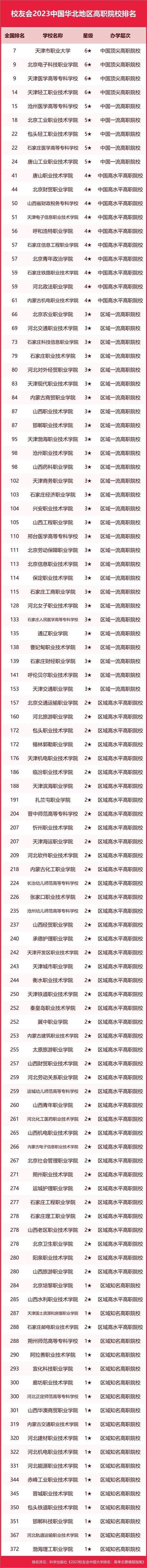 在最新校友會2023中國高職院校排名中,天津市職業(yè)大學(xué)綜合排名最高、辦學(xué)水平最高,全國排名第7名,名列校友會2023中國華北地區(qū)高職院校排名第一。北京電子科技職業(yè)學(xué)院、天津醫(yī)學(xué)高等?茖W(xué)校位居全國第9名,排行第2名。天津輕工職業(yè)技術(shù)學(xué)院排名全國第14名,排行第4名。滄州醫(yī)學(xué)高等?茖W(xué)校高居全國第15名,排名第5名。