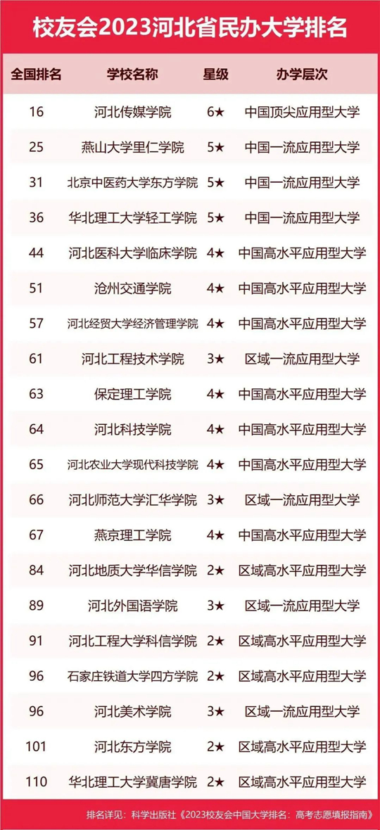 在最新校友會(huì)2023中國(guó)民辦大學(xué)排名中,河北傳媒學(xué)院綜合實(shí)力排名最高、辦學(xué)水平最高,全國(guó)排名第16名,勇奪校友會(huì)2023河北省民辦大學(xué)排名榜首。燕山大學(xué)里仁學(xué)院位居全國(guó)第25名,排行第2名。北京中醫(yī)藥大學(xué)東方學(xué)院名列全國(guó)第31名,位居第3名。華北理工大學(xué)輕工學(xué)院排名全國(guó)第36名,排行第4名。河北醫(yī)科大學(xué)臨床學(xué)院名列全國(guó)第44名,位居第5名。滄州交通學(xué)院排行全國(guó)第51名,位居第6名。河北經(jīng)貿(mào)大學(xué)經(jīng)濟(jì)管理學(xué)院排行全國(guó)第57名,排名第7名。河北工程技術(shù)學(xué)院位列全國(guó)第61名,位居第8名。保定理工學(xué)院高居全國(guó)第63名,排行第9名。河北科技學(xué)院高居全國(guó)第64名,位列第10名。