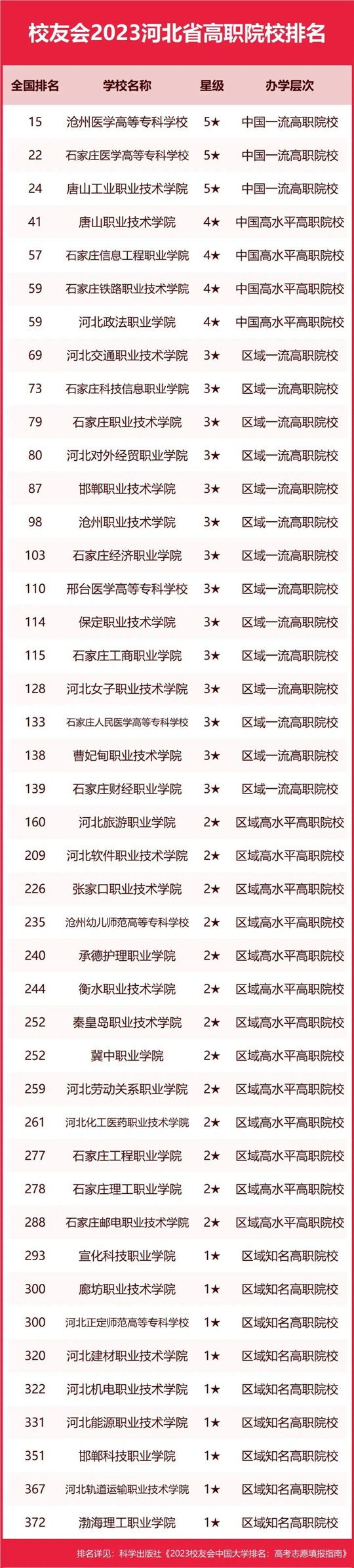 在最新校友會(huì)2023中國(guó)高職院校排名中,滄州醫(yī)學(xué)高等專(zhuān)科學(xué)校最具綜合競(jìng)爭(zhēng)力,全國(guó)排名第15名,雄居校友會(huì)2023河北省高職院校排名冠軍。石家莊醫(yī)學(xué)高等專(zhuān)科學(xué)校位居全國(guó)第22名,排名第2名。唐山工業(yè)職業(yè)技術(shù)學(xué)院排行全國(guó)第24名,名列第3名。唐山職業(yè)技術(shù)學(xué)院高居全國(guó)第41名,位居第4名。石家莊信息工程職業(yè)學(xué)院排行全國(guó)第57名,名列第5名。河北政法職業(yè)學(xué)院、石家莊鐵路職業(yè)技術(shù)學(xué)院排名全國(guó)第59名,高居第6名。河北交通職業(yè)技術(shù)學(xué)院位居全國(guó)第69名,高居第8名。石家莊科技信息職業(yè)學(xué)院名列全國(guó)第73名,高居第9名。石家莊職業(yè)技術(shù)學(xué)院位列全國(guó)第79名,名列第10名。