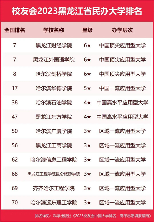 在最新校友會2023中國民辦大學(xué)排名中,黑龍江財經(jīng)學(xué)院、黑龍江外國語學(xué)院辦學(xué)水平最高,全國排名第7名,位居校友會2023黑龍江省民辦大學(xué)排名首位。哈爾濱劍橋?qū)W院排行全國第8名,位列第3名。哈爾濱華德學(xué)院排行全國第17名,位居第4名。哈爾濱石油學(xué)院位居全國第38名,排名第5名。