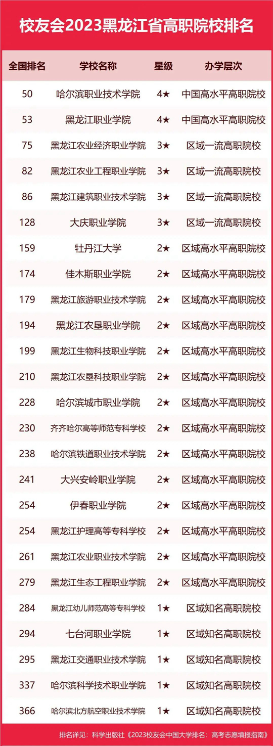 在最新校友會2023中國高職院校排名中,哈爾濱職業(yè)技術(shù)學(xué)院辦學(xué)水平最高,全國排名第50名,高居校友會2023黑龍江省高職院校排名冠軍。黑龍江職業(yè)學(xué)院高居全國第53名,位居第2名。黑龍江農(nóng)業(yè)經(jīng)濟職業(yè)學(xué)院位居全國第75名,高居第3名。黑龍江農(nóng)業(yè)工程職業(yè)學(xué)院高居全國第82名,位居第4名。黑龍江建筑職業(yè)技術(shù)學(xué)院名列全國第86名,排行第5名。