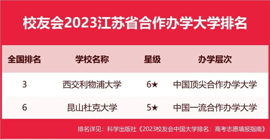在最新校友會2023中國合作辦學大學排名中,西交利物浦大學辦學實力最強、最具競爭力、辦學水平最高,全國排名第3名,榮登校友會2023江蘇省合作辦學大學排名首位。昆山杜克大學排名全國第6名,排行第2名。