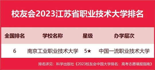 在最新校友會2023中國職業(yè)技術大學排名中,南京工業(yè)職業(yè)技術大學綜合實力最強、辦學水平最高、最具競爭力,全國排名第6名,穩(wěn)居校友會2023江蘇省職業(yè)技術大學排名冠軍。