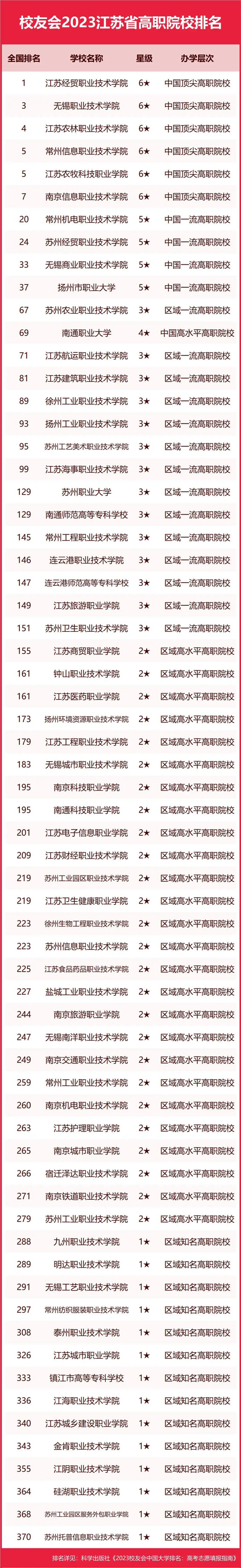 在最新校友會2023中國高職院校排名中,江蘇經貿職業(yè)技術學院實力最強、水平最高、最具競爭力,全國排名第1名,奪得校友會2023江蘇省高職院校排名冠軍。無錫職業(yè)技術學院位居全國第3名,位居第2名。江蘇農林職業(yè)技術學院名列全國第4名,名列第3名。常州信息職業(yè)技術學院、江蘇農牧科技職業(yè)學院排名全國第5名,高居第4名。南京信息職業(yè)技術學院位居全國第7名,位居第6名。常州機電職業(yè)技術學院名列全國第20名,排名第7名。蘇州經貿職業(yè)技術學院位居全國第24名,排行第8名。無錫商業(yè)職業(yè)技術學院高居全國第33名,排行第9名。揚州市職業(yè)大學排行全國第37名,名列第10名。