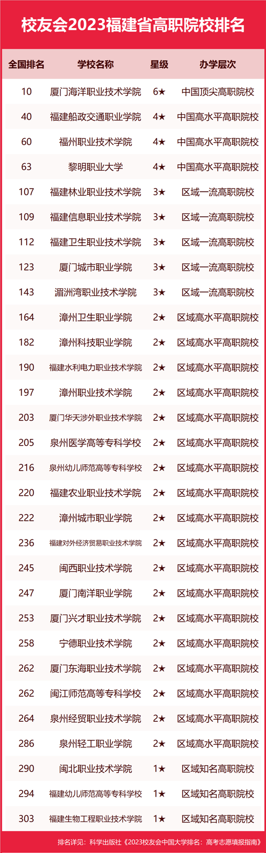 在最新校友會(huì)2023中國高職院校排名中,廈門海洋職業(yè)技術(shù)學(xué)院綜合實(shí)力排名最高、辦學(xué)水平最高,全國排名第10名,問鼎校友會(huì)2023福建省高職院校排名冠軍。福建船政交通職業(yè)學(xué)院排行全國第40名,排行第2名。福州職業(yè)技術(shù)學(xué)院排名全國第60名,位居第3名。黎明職業(yè)大學(xué)名列全國第63名,位居第4名。福建林業(yè)職業(yè)技術(shù)學(xué)院排行全國第107名,名列第5名。福建信息職業(yè)技術(shù)學(xué)院位列全國第109名,高居第6名。福建衛(wèi)生職業(yè)技術(shù)學(xué)院位列全國第112名,高居第7名。廈門城市職業(yè)學(xué)院位列全國第123名,高居第8名。湄洲灣職業(yè)技術(shù)學(xué)院排名全國第143名,位列第9名。漳州衛(wèi)生職業(yè)學(xué)院排行全國第164名,高居第10名。