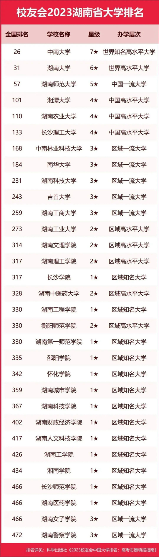 | 校友會2023湖南省大學排名,中南大學、湖南涉外經濟學院等第一 |