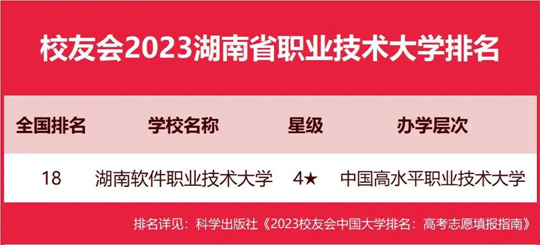 在最新校友會2023中國職業(yè)技術大學排名中,湖南軟件職業(yè)技術大學辦學實力最強、最具核心競爭力,全國排名第18名,穩(wěn)居校友會2023湖南省職業(yè)技術大學排名首位。