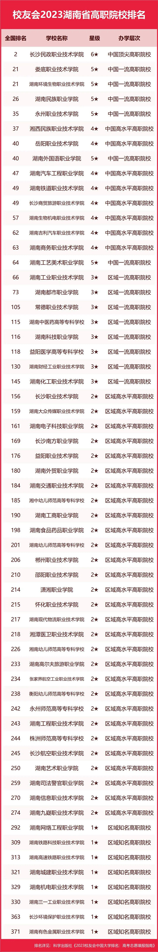 黃河水利職業(yè)技術學院、深圳職業(yè)技術學院、江蘇經貿職業(yè)技術學院位居2023中國高職院校排名首位。長沙民政職業(yè)技術學院奪得校友會2023湖南省高職院校排名首位。海南科技職業(yè)大學高居2023中國職業(yè)技術大學排名第一。湖南軟件職業(yè)技術大學名列校友會2023湖南省職業(yè)技術大學排名第一。