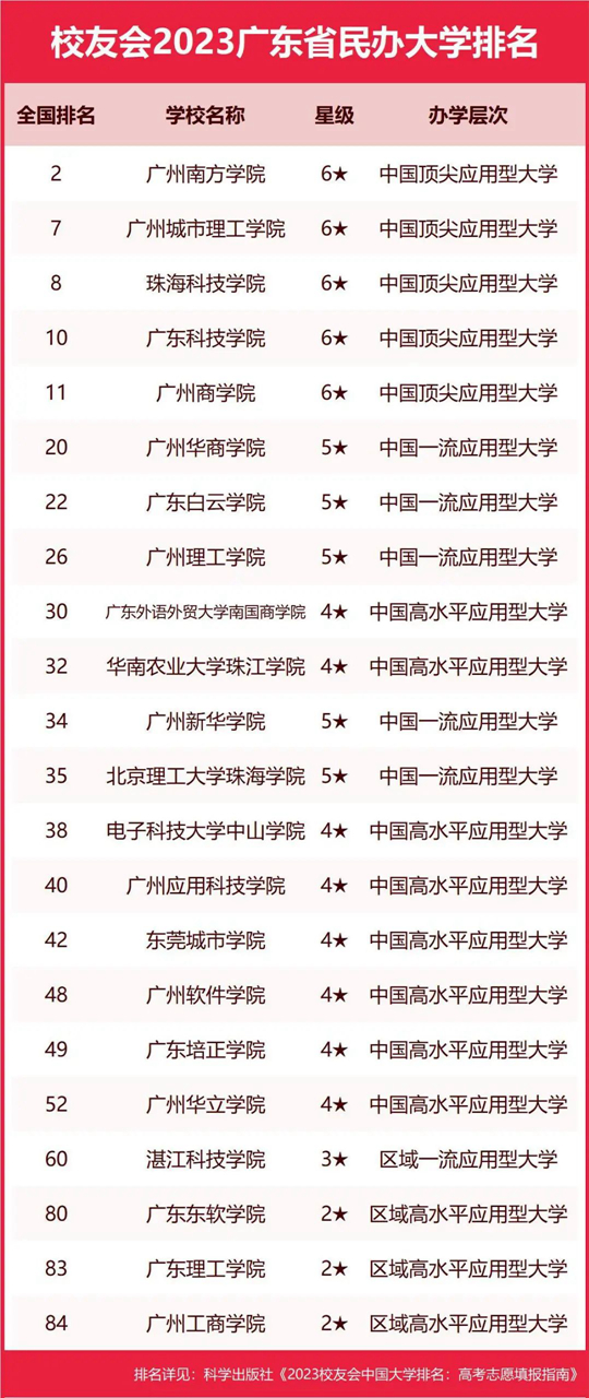 在最新校友會(huì)2023中國(guó)民辦大學(xué)排名中,廣州南方學(xué)院實(shí)力最強(qiáng)、水平最高、最具競(jìng)爭(zhēng)力,全國(guó)排名第2名,位列校友會(huì)2023廣東省民辦大學(xué)排名榜首。廣州城市理工學(xué)院位居全國(guó)第7名,位列第2名。珠?萍紝W(xué)院高居全國(guó)第8名,排行第3名。廣東科技學(xué)院排名全國(guó)第10名,名列第4名。廣州商學(xué)院排名全國(guó)第11名,位居第5名。