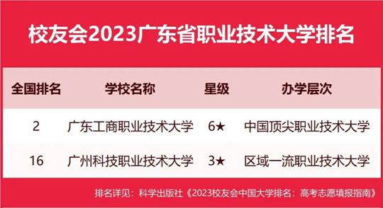 在最新校友會(huì)2023中國(guó)職業(yè)技術(shù)大學(xué)排名中,廣東工商職業(yè)技術(shù)大學(xué)實(shí)力最強(qiáng)、水平最高、最具競(jìng)爭(zhēng)力,全國(guó)排名第2名,名列校友會(huì)2023廣東省職業(yè)技術(shù)大學(xué)排名冠軍。廣州科技職業(yè)技術(shù)大學(xué)位居全國(guó)第16名,位居第2名。