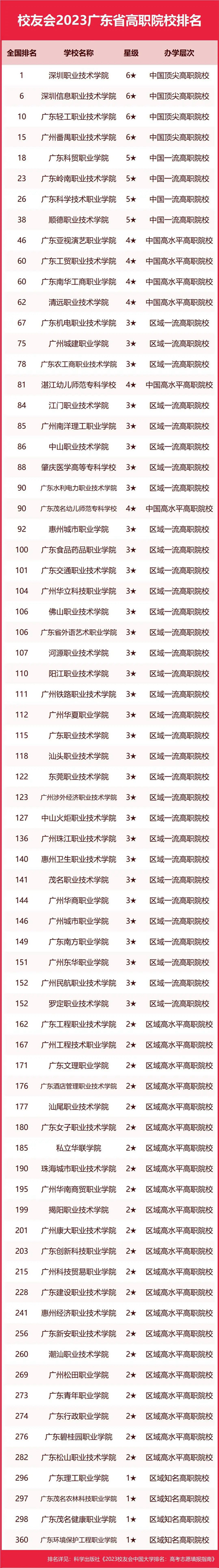 在最新校友會(huì)2023中國(guó)高職院校排名中,深圳職業(yè)技術(shù)學(xué)院最具綜合競(jìng)爭(zhēng)力,全國(guó)排名第1名,高居校友會(huì)2023廣東省高職院校排名第一。深圳信息職業(yè)技術(shù)學(xué)院排名全國(guó)第6名,位居第2名。廣東輕工職業(yè)技術(shù)學(xué)院名列全國(guó)第10名,排名第3名。廣州番禺職業(yè)技術(shù)學(xué)院排名全國(guó)第15名,位居第4名。廣東科貿(mào)職業(yè)學(xué)院位居全國(guó)第18名,位居第5名。
