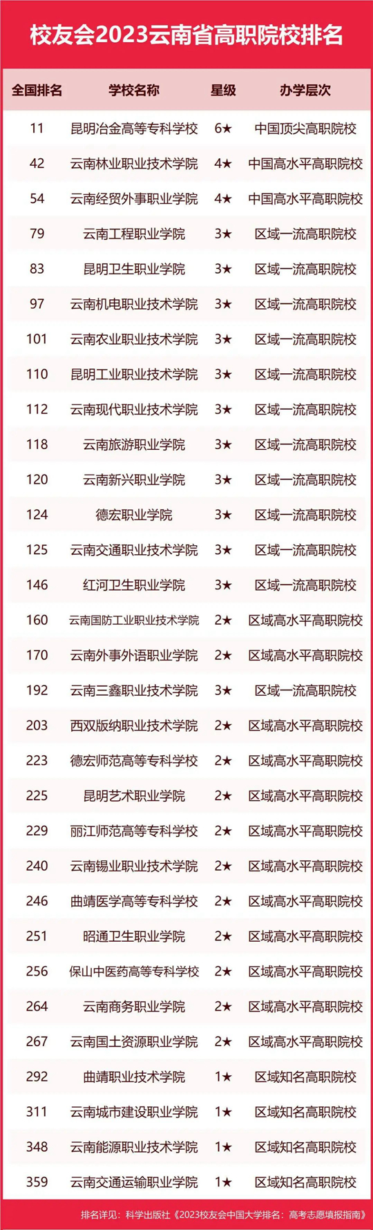 在最新校友會(huì)2023中國高職院校排名中,昆明冶金高等專科學(xué)校辦學(xué)水平最高,全國排名第11名,位居校友會(huì)2023云南省高職院校排名冠軍。云南林業(yè)職業(yè)技術(shù)學(xué)院高居全國第42名,高居第2名。云南經(jīng)貿(mào)外事職業(yè)學(xué)院高居全國第54名,排行第3名。云南工程職業(yè)學(xué)院排行全國第79名,名列第4名。昆明衛(wèi)生職業(yè)學(xué)院排行全國第83名,排名第5名。