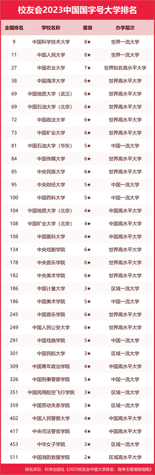 為了給2023年全國高考考生和家長選擇填報中國“國字號”大學提供參考,全國第三方大學評價機構(gòu)艾瑞深校友會網(wǎng)撰寫完成、科學出版社即將出版發(fā)行的《2023校友會中國大學排名:高考志愿填報指南》最新發(fā)布校友會2023中國國字號大學排名。