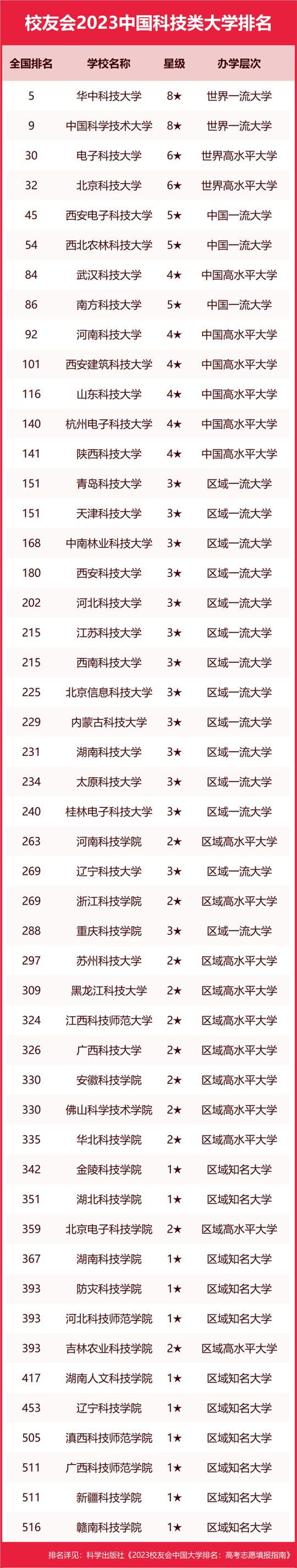 在最新校友會(huì)2023中國(guó)大學(xué)排名中,華中科技大學(xué)綜合排名最高、辦學(xué)水平最高,全國(guó)排名第5名,位列校友會(huì)2023中國(guó)科技類大學(xué)排名首位。中國(guó)科學(xué)技術(shù)大學(xué)排名全國(guó)第9名,位居第2名。電子科技大學(xué)位居全國(guó)第30名,位列第3名。北京科技大學(xué)位列全國(guó)第32名,排名第4名。西安電子科技大學(xué)位列全國(guó)第45名,位居第5名。
