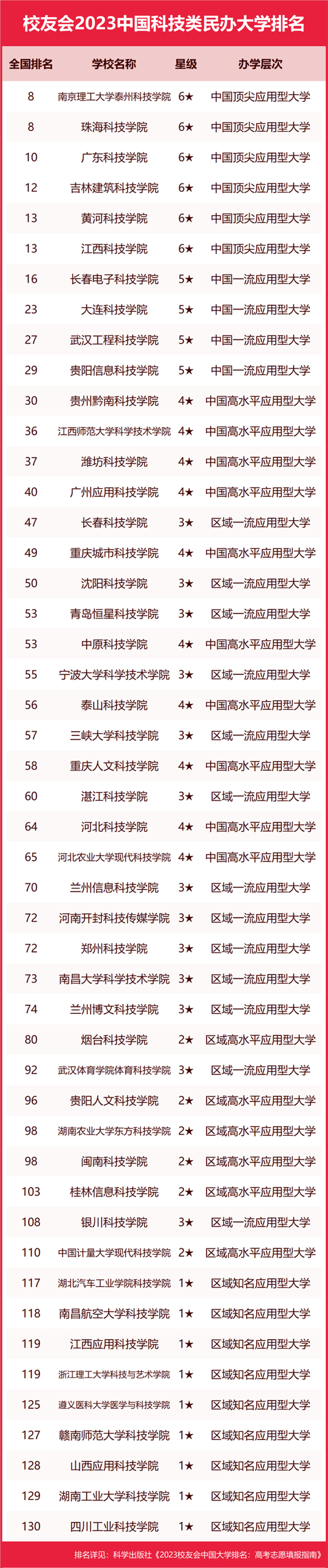 在最新校友會(huì)2023中國(guó)民辦大學(xué)排名中,南京理工大學(xué)泰州科技學(xué)院、珠海科技學(xué)院實(shí)力最強(qiáng)、水平最高、最具競(jìng)爭(zhēng)力,全國(guó)排名第8名,名列校友會(huì)2023中國(guó)科技類民辦大學(xué)排名冠軍。廣東科技學(xué)院位列全國(guó)第10名,位居第3名。吉林建筑科技學(xué)院名列全國(guó)第12名,名列第4名。江西科技學(xué)院、黃河科技學(xué)院高居全國(guó)第13名,高居第5名。
