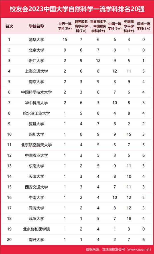 自然科學(xué)涵蓋理學(xué)、工學(xué)、農(nóng)學(xué)、醫(yī)學(xué)等門類學(xué)科。在校友會2023中國大學(xué)一流學(xué)科排名中,清華大學(xué)、北京大學(xué)自然科學(xué)領(lǐng)域?qū)W科研究實(shí)力最強(qiáng),學(xué)科水平最高,分別有15個、9個學(xué)科榮膺2023中國八星級學(xué)科(8★)美譽(yù),躋身世界一流學(xué)科行列,雄居校友會2023中國大學(xué)自然科學(xué)一流學(xué)科排名冠亞軍。浙江大學(xué)第3,上海交通大學(xué)第4,南京大學(xué)第5,中國科學(xué)技術(shù)大學(xué)第6,華中科技大學(xué)第7,哈爾濱工業(yè)大學(xué)第8,復(fù)旦大學(xué)第9,四川大學(xué)第10。